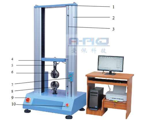 1、拉力機上橫梁     2、拉力機支柱     3、機械限位桿       4、移動橫檔